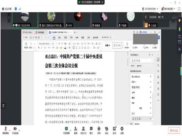 接着,与会党员开展交流发言。教师党员牟丹谈到,作为一名高校教师,我们肩负着为国家育才、为社会尽责的重要使命。我们要不断强化责任担当意识,尽职尽责地做好本职工作,为学生的学习和发展提供有力的支持和帮助。同时,我们也要关注学生的思想动态和心理状态,及时给予关爱和引导。学生党员吴倩谈到,通过学习,我深刻领会到全面深化改革的必要性和紧迫性,以及推进中国式现代化的重大意义。作为一名学生党员,我们要提高理论修养,增强能力本领,努力践行新时代好青年使命担当,与国家发展大局同频共振、同向同行。